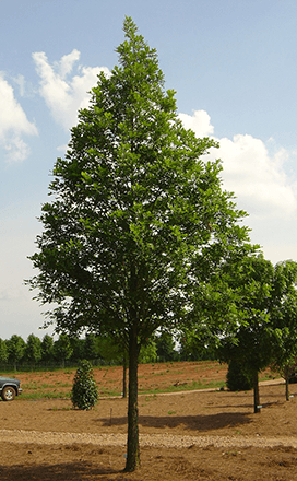 Native shade tree - own root. Resilience’s™ uniqueness resides in the lustrous leathery leaves, changing yellow and burnt orange in fall. Leaf drop is clean and uniform, without the lingering dried brown foliage common to many oak species. The grey-brown winter branches and trunk assume a scaly texture, presenting a sculptural silhouette in the winter landscape. Branches are upswept, making Resilience™ Overcup Oak a perfect street tree. Resilience™ is very tolerant of heavy low-oxygen/wet urban soils, while adaptable to drier conditions.