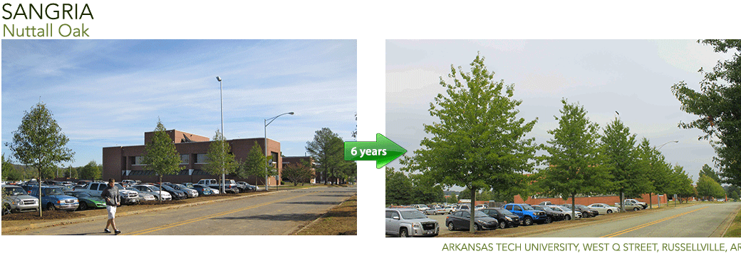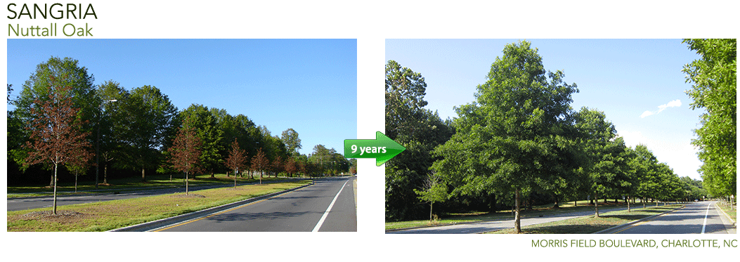 Native shade tree - own root. Sangria® Nuttall Oak has leaves that emerge a deep burgundy in the spring, holding the color for several weeks before returning to green. An excellent choice to serve as a single specimen or to line streets, Sangria® will stand out in spring with striking impact.